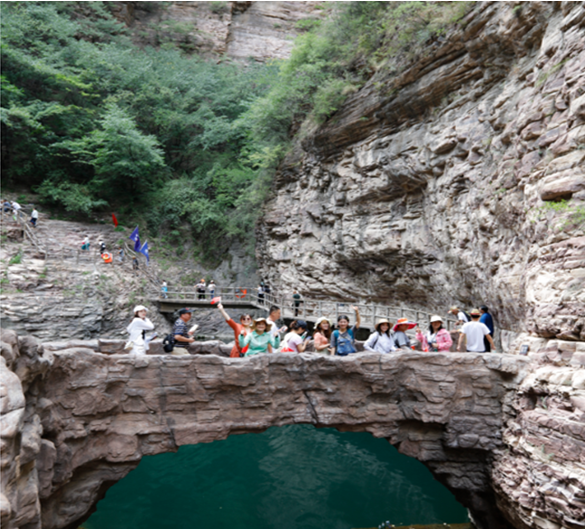 中午12點到達(dá)目的地,休整用餐后,開始游覽大峽谷景觀—景景相連,山靈水秀的谷中之谷桃花谷和擁有壯美風(fēng)光、百里畫廊之稱的太行天路。桃花谷內(nèi)黃龍?zhí)?、飛龍峽瀑布、飛龍峽棧道、九連瀑等景點珠聯(lián)璧合,顯示出深峽藏秀的悠遠(yuǎn)意境?!疤刑炻贰本皡^(qū)位于太行山之巔,全長約30km,一路望去,峽谷深邃、巖壁峭立,仿佛鬼斧神工,大氣磅礴。